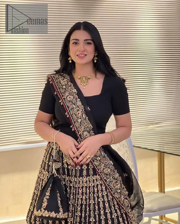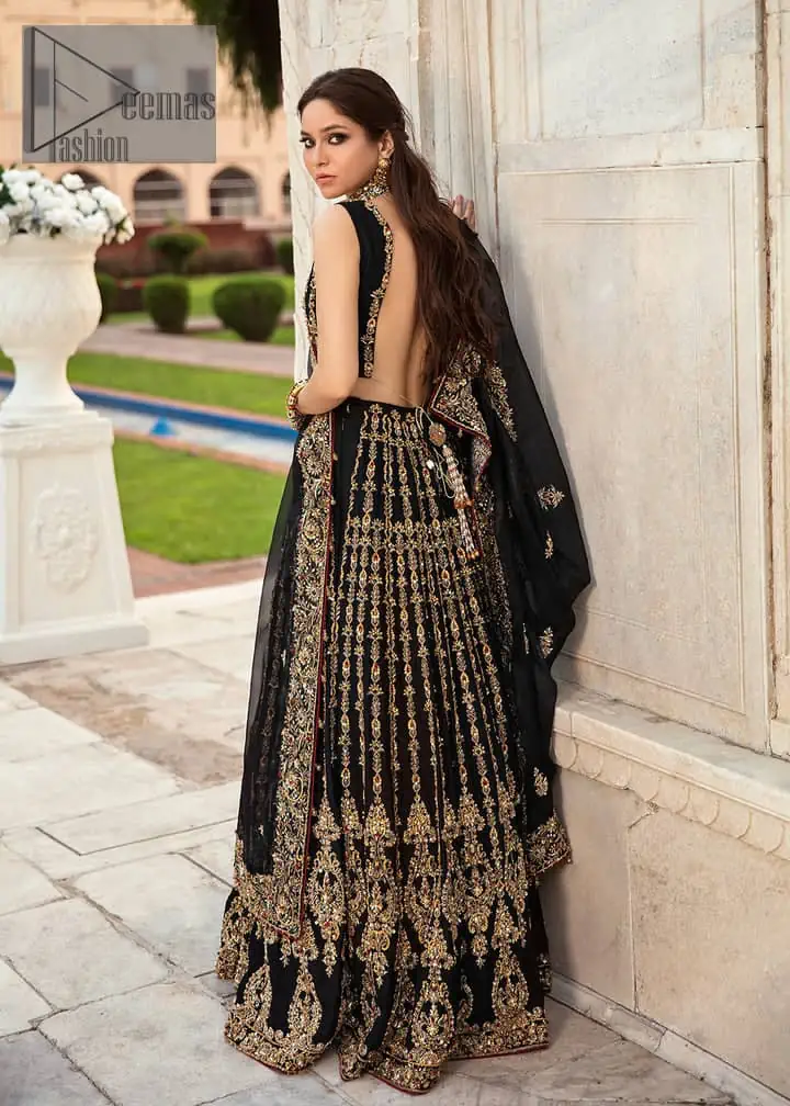 Black is the second way to show confidence in your nikah. This black article is attractively rendered with golden embroidery in which details speak for themselves. First of all the blouse in the article is as amazing as in the picture. It is further prominent with tilla, dabka, crystal, and kora to enhance the power of black. The boat shape neckline also increases the beauty of the blouse when comes with a sleeveless style. Further, it is paired up with a black can-can lehenga which is heavily embellished with light golden embroidery. Complete this look with a black dupatta which is again rendered with four-sided borders and floral motifs all over.