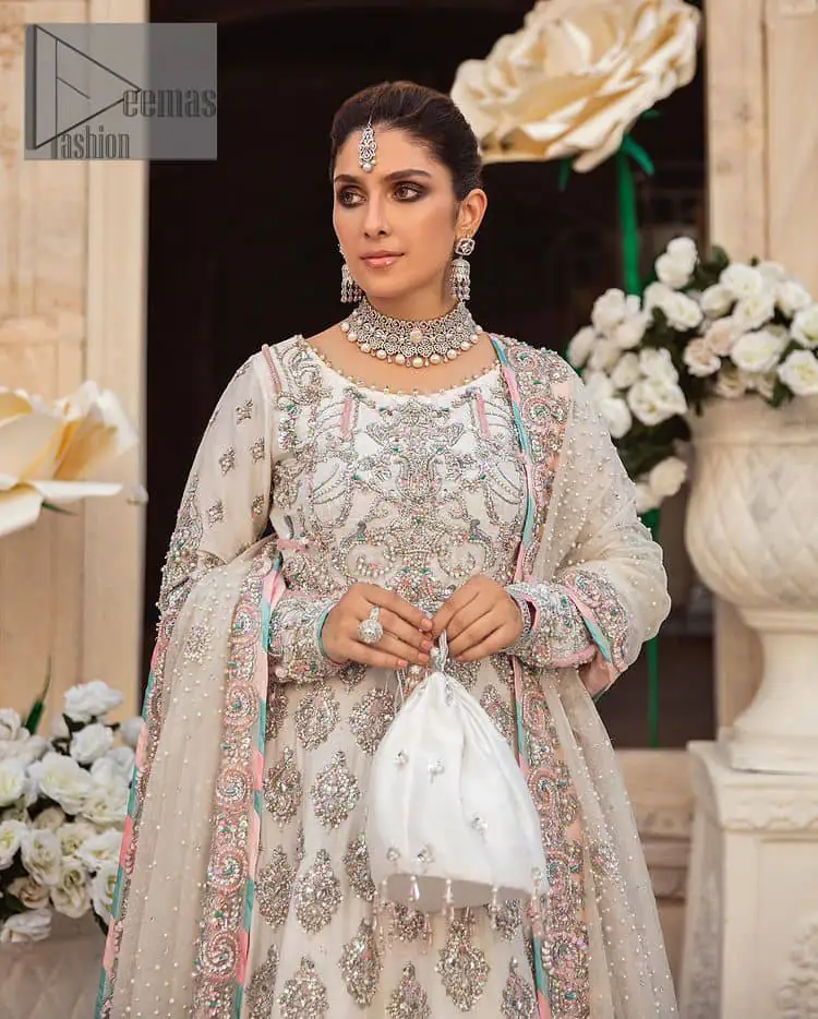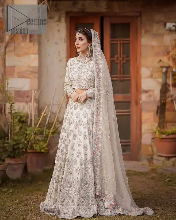 Ivory is effortlessly snappy and fun with the essence of pop. Introducing the Nikah outfit for the happiest bride. Start the outfit with an astonishing blouse with silver embroidery, including kora, dabka, tilla and Kundan, to make this outfit a unique, fun piece. Further, it is enhanced with a boat-shaped neckline with intimate full sleeves. It is beautifully organized with a can-can lehenga in the same colour to embrace the magic of love. The floral embroidery on the lehenga gives a super aesthetic feeling to the outfit. Finish this look with the handsome dupatta in the same hue, with a four-sided embellished border, and sequins sprayed all over to show the essence of pop.