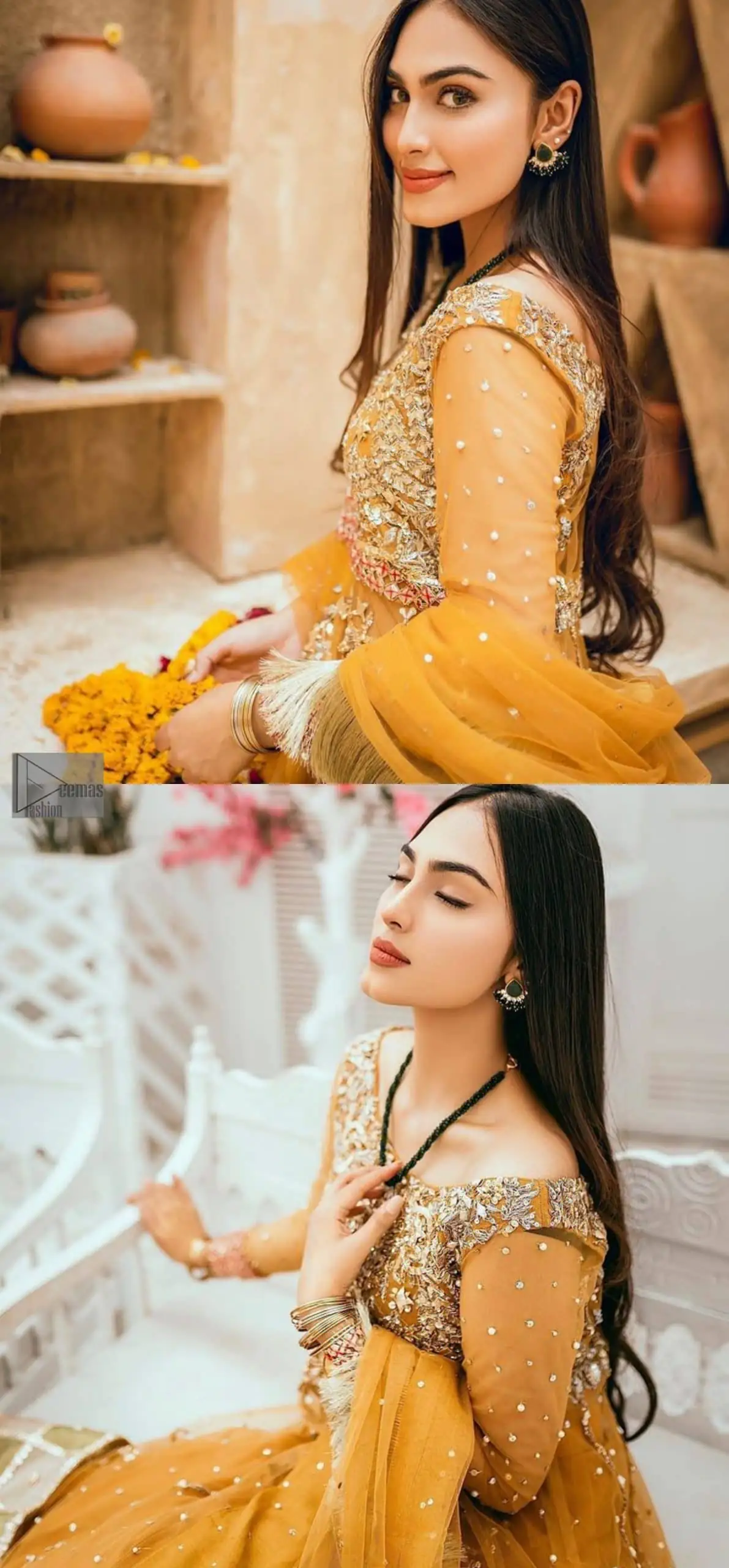 Mustard is just associated and boosts your Mehandi. Presenting a dreamy mustard frock with a heavily embroidered bodice on a silver base. The bodice is further enhanced with handwork that includes crystal, tilla, kora and dabka work. Furthermore, the boat shape neckline and tiny work on full sleeves have the super style just to boost your day. The bottom is decorated with artistic embroidery that is adding glam to it. The Mehandi look is completed with an artistically crafted frilled lehenga which frill borders displaying the traditional hint of charm. It is coordinated with a dupatta in the same colour that is embellished with four-sided borders as well.