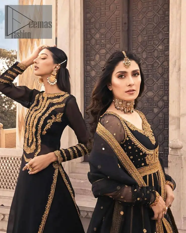Black is just associated with a romantic evening. To make your event super dazzling in Pakistani Party Dress and take a title of the start of the night so just go with our black can-can maxi. The body of the maxi is finished with golden embroidery which embraces golden tilla, dabka, kora and zardozi work. The full sleeves of the maxi added an astonishing vibe when paired up with the V shape neckline. Furthermore, the bottom line of the maxi is again embellished with heavy golden work. Pakistani Party Dress is organized with a black dupatta which is embellished with four-sided borders and sequins sprayed all over.