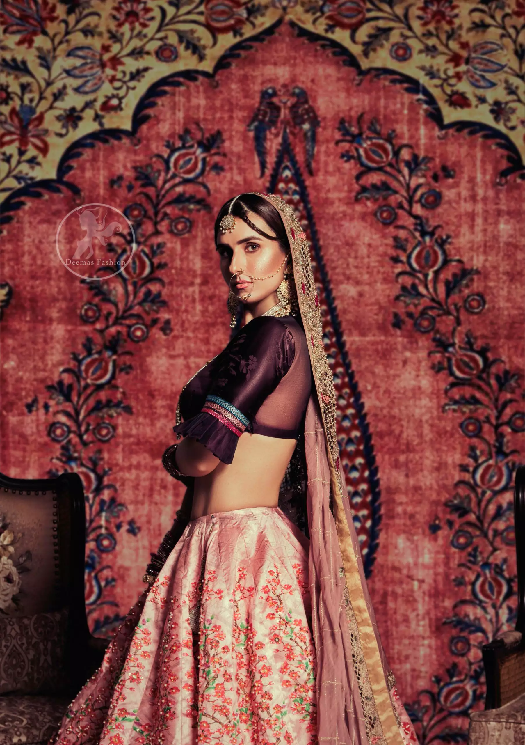 This outfit is a timeless beauty. The dark purple self-printed blouse is decorated with applique. The raw silk classic lehenga is adorned with digital print. Its floral print is further decorated with Swarovski, tilla, and kora dabka. Its beautiful printed border adds to the look. This outfit is beautifully coordinated with a peach pink dupatta with heavily embroidered borders.